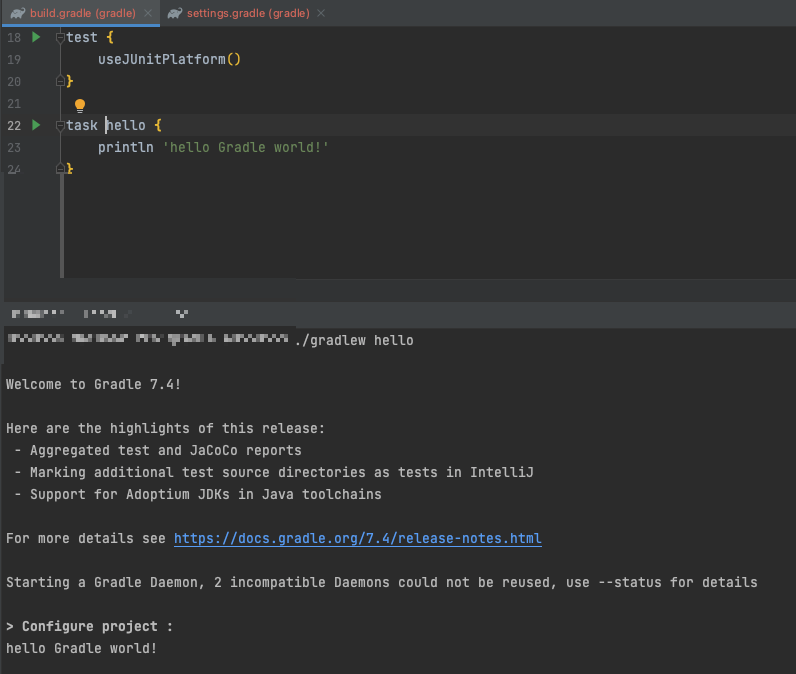아래와 같이 hello task를 추가한후 터미널에서 ./gradlew hello 를 입력하면 손쉽게 작동하는 걸 확인할 수 있다.