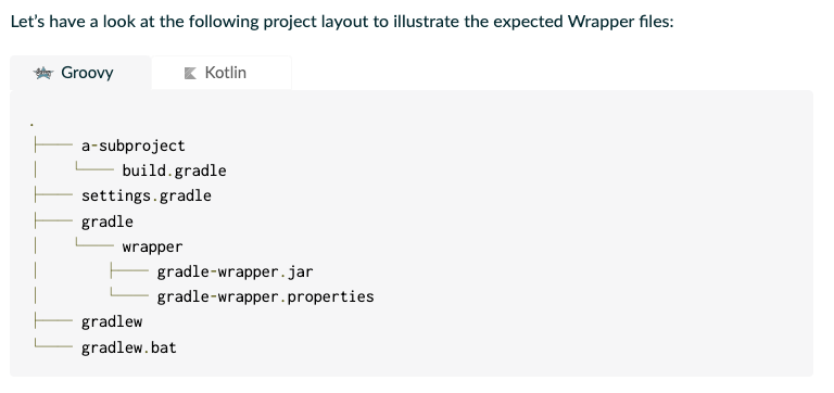 The recommended way to execute any Gradle build is with the help of the Gradle Wrapper (in short just “Wrapper”). The Wrapper is a script that invokes a declared version of Gradle, downloading it beforehand if necessary. As a result, developers can get up and running with a Gradle project quickly without having to follow manual installation processes saving your company time and money.
