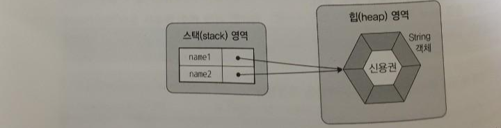 변수가 동일한 문자열 리터럴인 "신용권"을 참조할 경우 name1과 name2는 동일한 String 객체 참조.