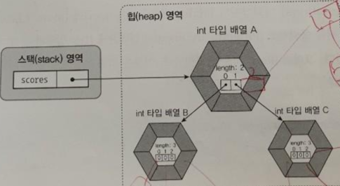 배열 변수 scores에는 배열의 힙 영역의 주소가 저장된다. 자바에선 배열을 객체로 취급한다.