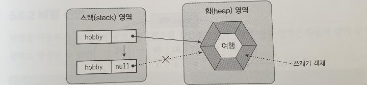 다음 코드처럼 hobby 변수가 String 객체를 참조하였으나, null을 대입함으로써 더 이상 String 객체를