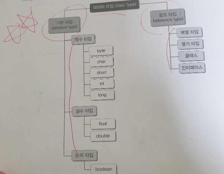 자바의 데이터 타입에는 크게 기본타입(원시 타입 : primitive type)과 참조 타입(reference type)으로 분류된다.