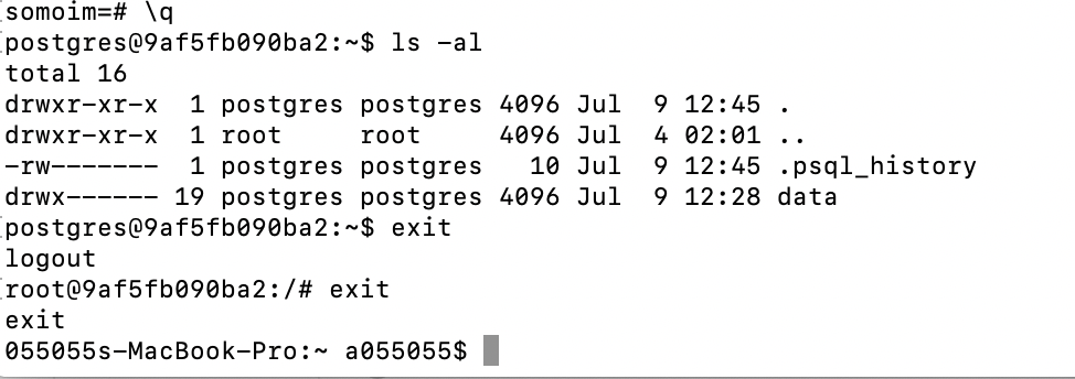 종료 할 때는 \q로 psql을 종료하고 exit를 입력하여 postgre에서 로그아웃 한뒤, 한번 더 exit를 입력하여 컨테이너에서 나가면 됩니다.