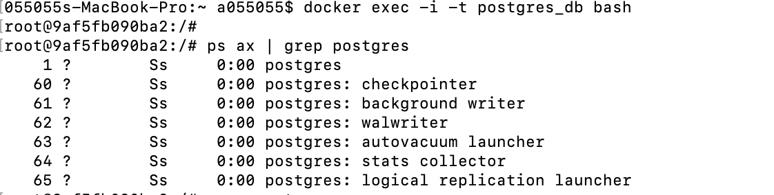 그리고 컨테이너 안에서 ps ax | gresp postges 명령어를 실행하면 postgres가 잘 돌고 있는 것을 확인할 수 있습니다.