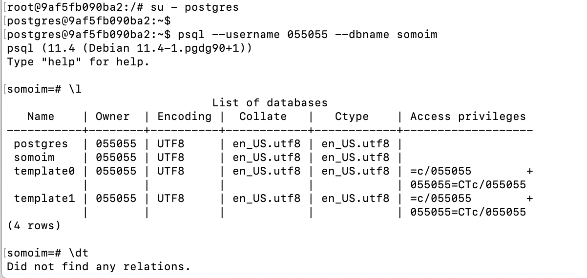 이제 user를 postgres로 변경한 뒤 postgresql의 Command Line Interface인 psql로 접속하여 데이터 베이스를 확인하겠습니다.