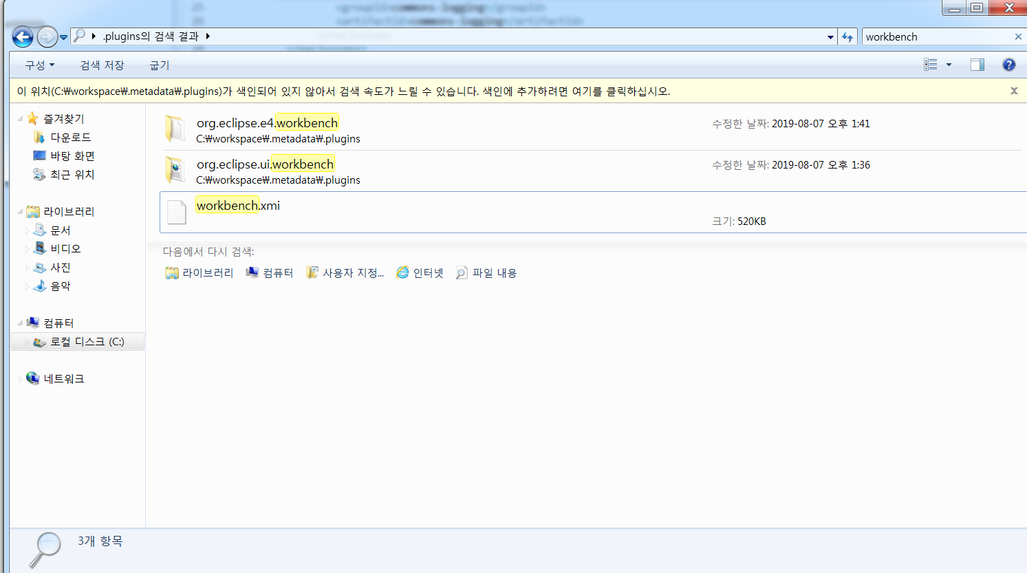 workbench관련한 오류는 강제종료나 플러그인 오류로 인해 workbench가 정상으로 저장되지 않아서 주로 발생한다.