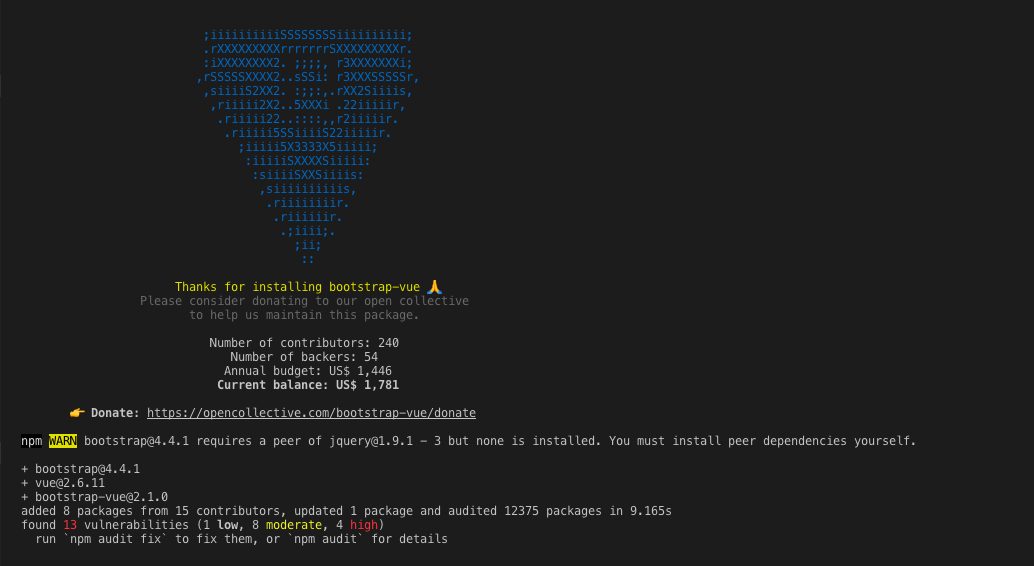 vue.js에서 jquery없이 bootstrap을 사용하기 위해 bootstrap-vue를 설치 하려고 한다.