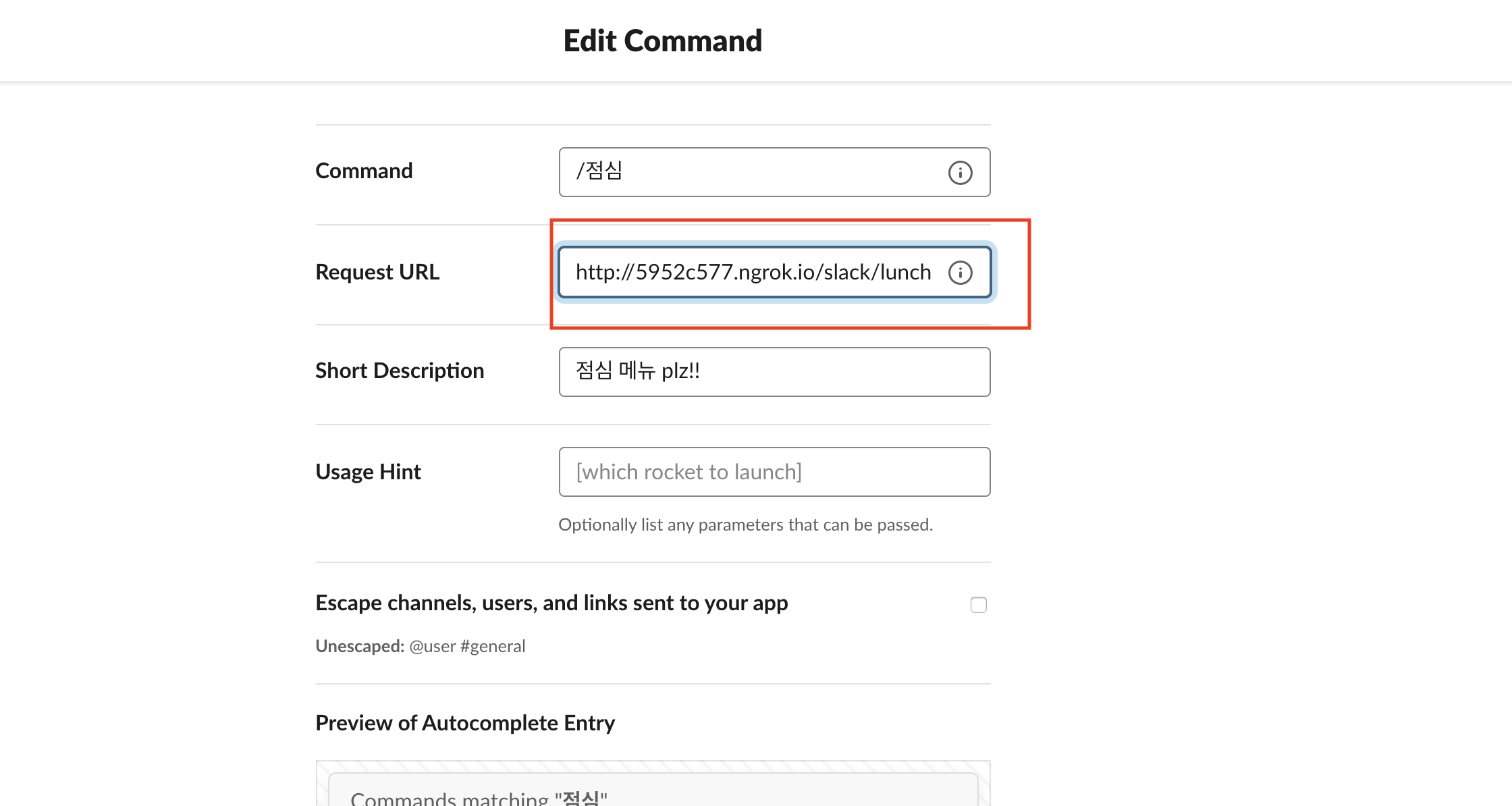 다시 슬랙으로 가서 Request URL에 ngrok에서 할당받은 주소(http://5952c577.ngrok.io) + API Path(/slack/lunch)를 입력하자.