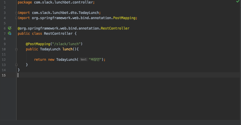 Springboot를 이용하여 간단하게 '짜장면'을 리턴하는 프로젝트를 만들어봤다. 필요에 따라 Enum Type 또는 DB를 이용하여 랜덤하거나 날씨에 따른 응답 값을 적절히 주면 된다. 또한, 위 예제와 같이 응답값 type을 Markdown으로 줄 수도 있다.