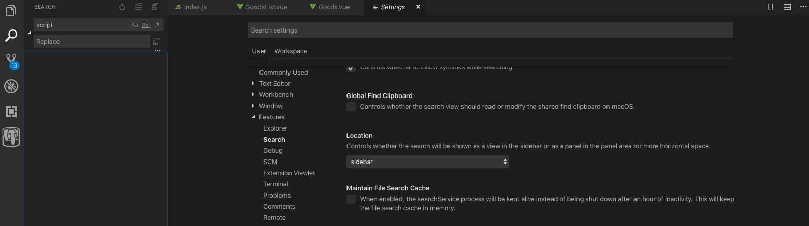 Activity Bar(Side Bar)에 Search가 Default로 되어 있지만, 아래와 같이 panel에 위치되어 있는 경우가 있다.