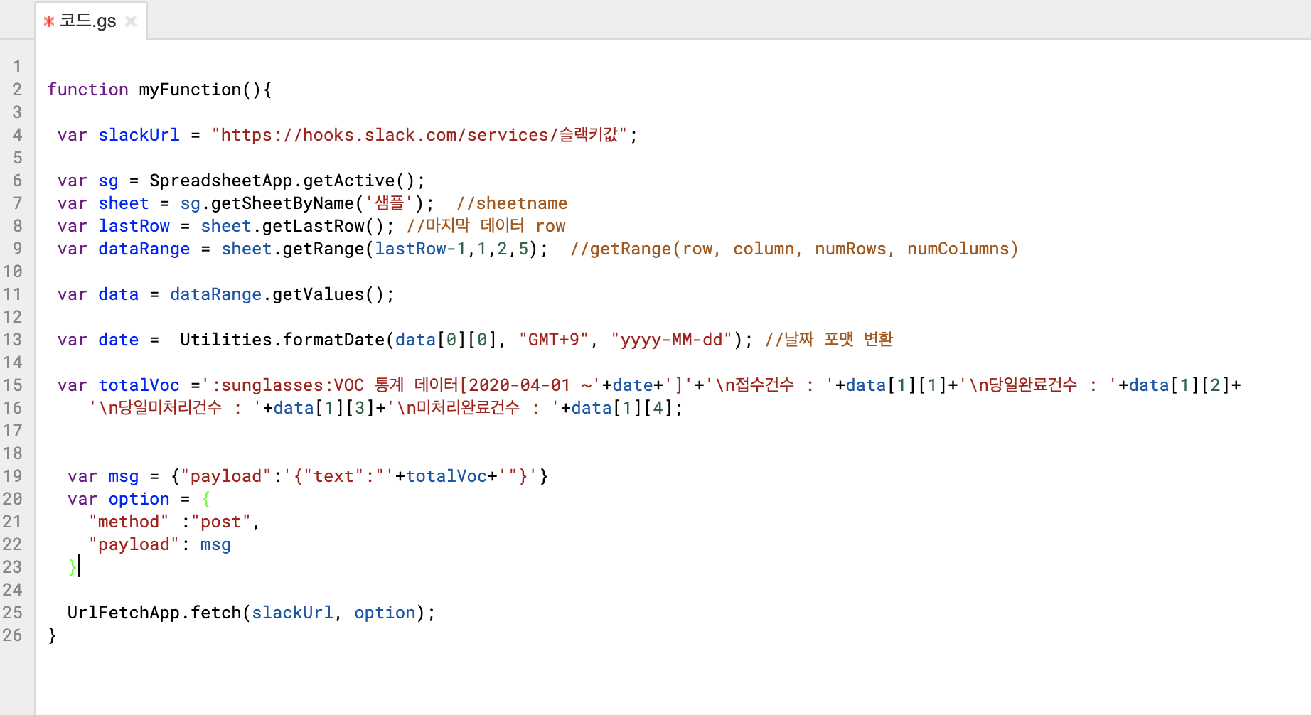 055055 2020. 4. 8. 08:22구글 앱 스크립트를 하여, 다양한 구글앱 및 외부 앱과의 연동으로 업무 자동화를 할 수 있다. 아래 예제는 스프레드시트에서 데이터를 읽은 후, 슬랙으로 메세지를 보내는 간단한 샘플 코드이다. 샘플 코드이기 때문에 하드코딩된 부분이 많지만, 다양한 함수를 활용한다면 더 동적으로 만들 수 있을 것이다.