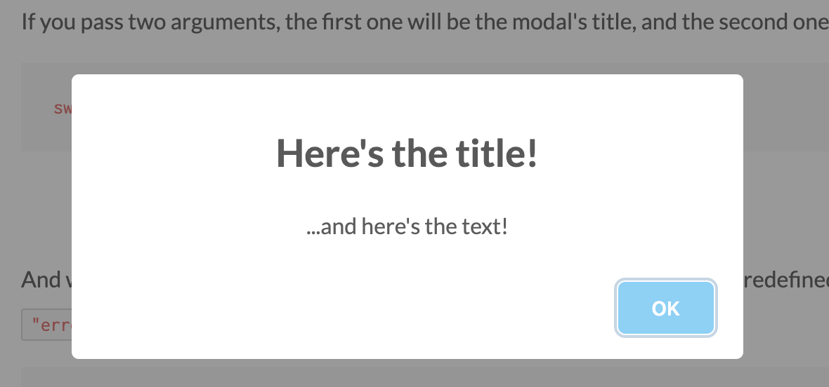swal("Here's the title!", "...and here's the text!");